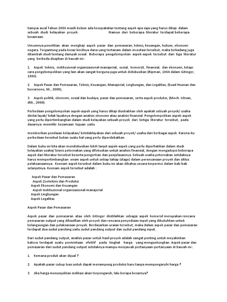 Dalam aspek hukum, mengacu pada uu no. Pasar dan pemasaran merupakan aspek dasar yang diteliti dalam studi kelayakan. Dan budaya, aspek pasar dan pemasaran, aspek teknis dan teknologi sampai dengan aspek manajemen dan keuangannya, dimana itu semua digunakan untuk dasar penelitian studi kelayakan dan hasilnya