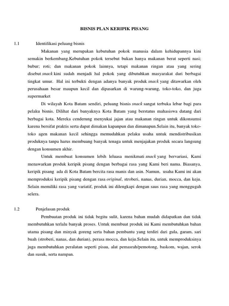Contoh proposal usaha keripik pisangthe papa chips sendiri adalah singkatan dari panganan palu, dalam olahan keripik pisang. Untuk membuat konsumen lebih leluasa menikmati snack yang bervariasi, kami menawarkan produk keripik pisang dengan berbagai rasa yang kami beri nama.biasanya, keripik pisang ada di kota batam bercita rasa manis dan asin. Usaha kami memproduksi keripik sesuai dengan kriteria yang usaha kami tetapkan agar kualitas produk tetap terjamin.usaha keripik piasng aneka rasa ini memberikan pilihan kepada konsumen berbagai rasa yang disukai.rasa keripik pisang aneka rasa yang ditawarkan tentunya sudah menjadi kesepakatan perusahaan dan memenuhi kriteria usaha.