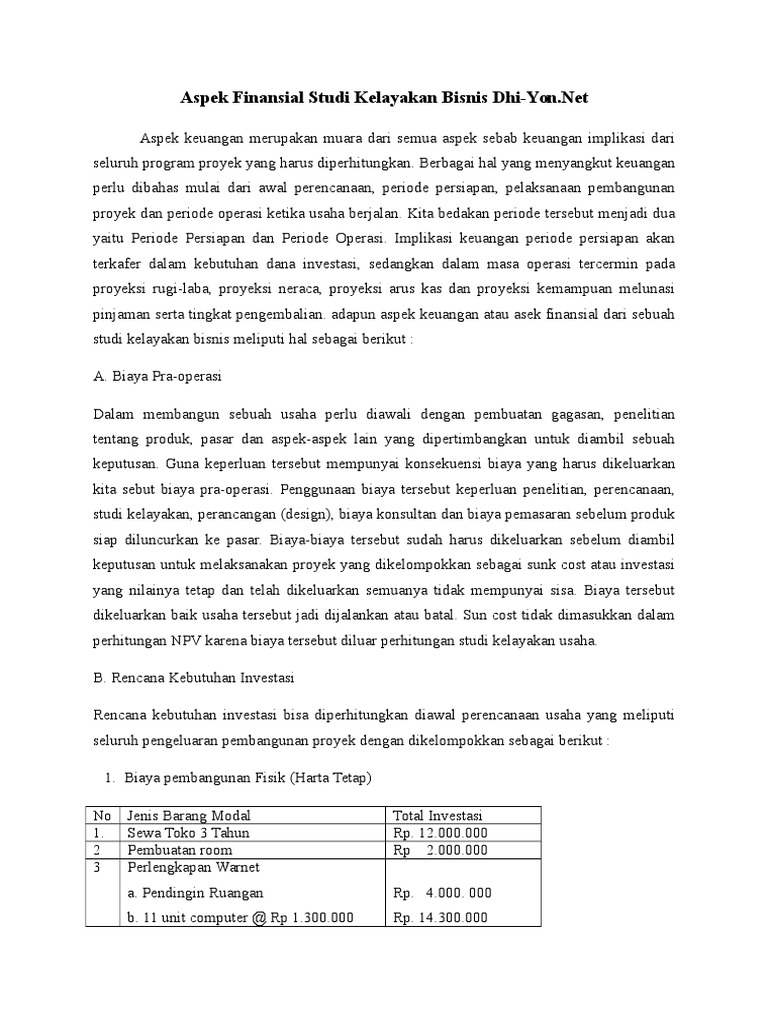 Contoh kasus aspek manajemen dalam studi kelayakan bisnis. Aspek teknis atau operasi studi kelayakan bisnis. Dalam aspek ini yang akan diteliti adalah mengenai lokasi usaha, baik kantor pusat,. Feasibility study atau studi kelayakan bisnis adalah suatu kegiatan yang isinya mempelajari secara mendalam tentang kegiatan bisnis atau usaha yang akan dijalankan untuk menentukan apakah layak atau tidak suatu bisnis dijalankan dari berbagai aspek yang mendukung dalam bisnis.