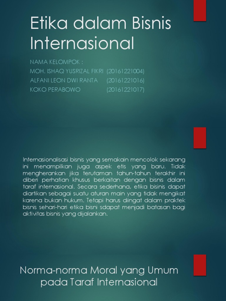 Dengan saran transportasi dan komunikasi yang kita miliki sekarang, bisnis internasional bertambah penting lagi. Makalah bisnis internasional etika dan tanggung jawab sosial dalam bisnis internasional dosen pengampu : Sopyan 12010110120015 alifia palokoto 12010110120062 dito surya wijaya 12010110120130 gilang prasidya jati 12010110130184 yesica yulian adicondro 12010111130160 dosen pengampu :