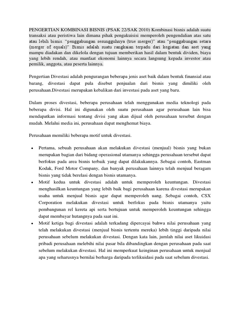 Akuisisi kegiatan usaha yakni suatu kegiatan pengambilalihan kegiatan usaha tertentu dari suatu perusahaan target seperti alat produksi, hak milik intelektual dan juga jaringan bisnis oleh perusahaan pengakusisi. • sebagai imbalan, pt a membayar tunai rp100.000 dan menerbitkan 500 lembar saham biasa, nilai nominal rp1.000/lembar, nilai wajar rp1.200/lembar, untuk diserahkan kepada pemegang saham pt b. Pengertian kombinasi bisnis (psak 22/sak 2010) kombinasi bisnis adalah suatu.